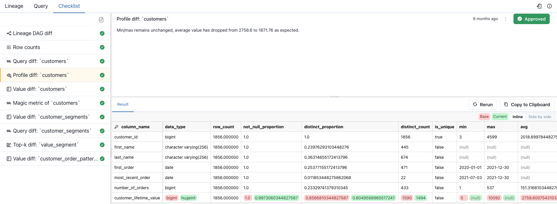 - Metric and data comparisons: Use Profile, Value, Top-K, and Histogram Diffs to compare results before and after changes. Validate things like row counts, category distributions, and numeric ranges without writing extra SQL.