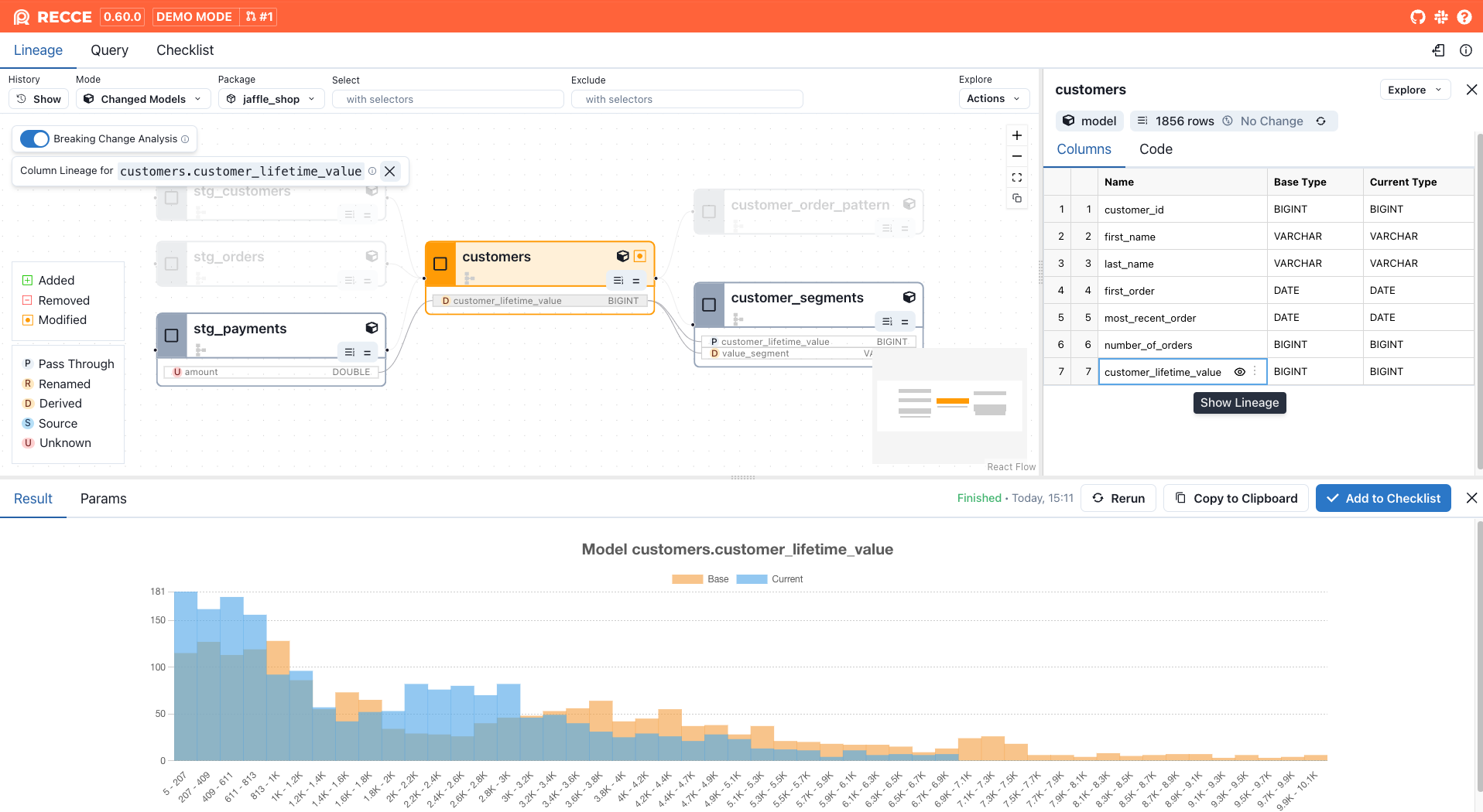 - Lineage and impact mapping: Quickly see which models and columns are affected by a change. Navigate lineage down to the column level, and spot breaking changes with clear visual cues.