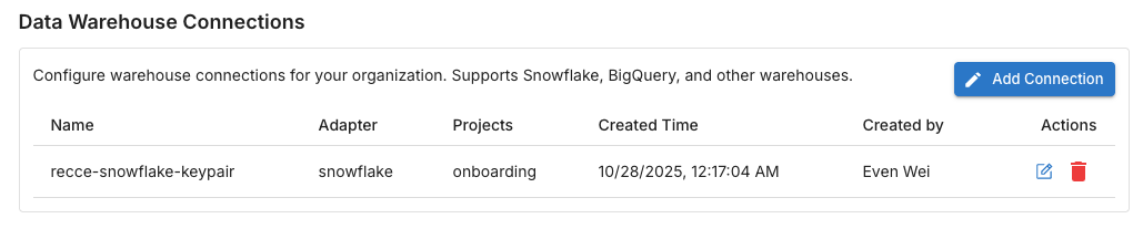 Navigate to Organization Settings in Recce Cloud. Your data warehouse should appear.