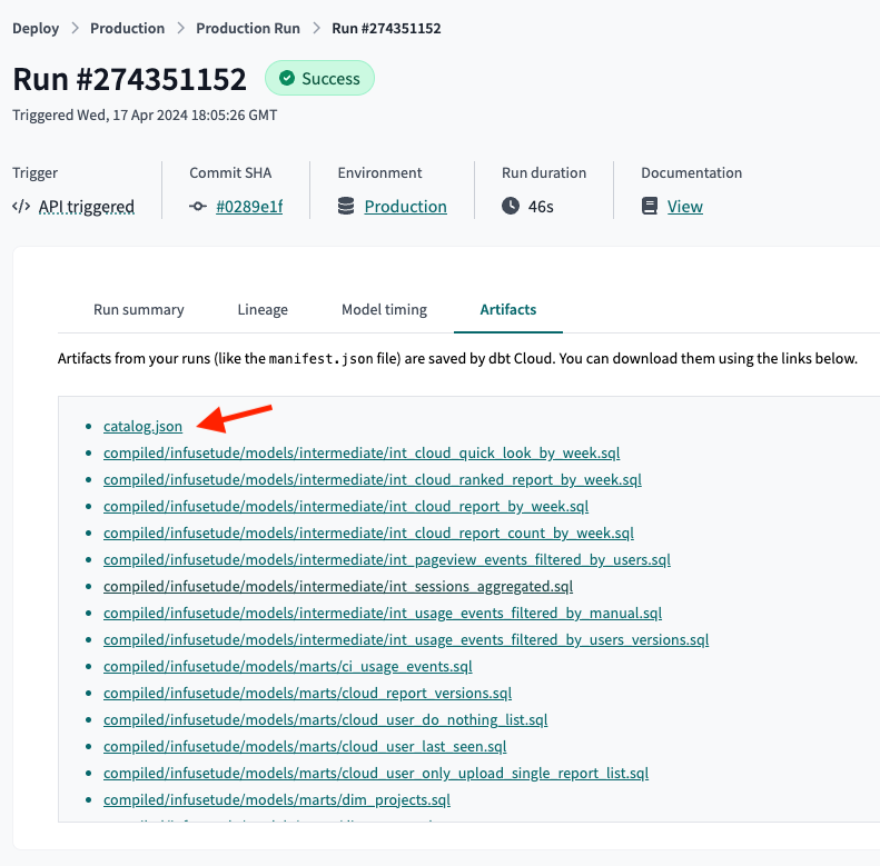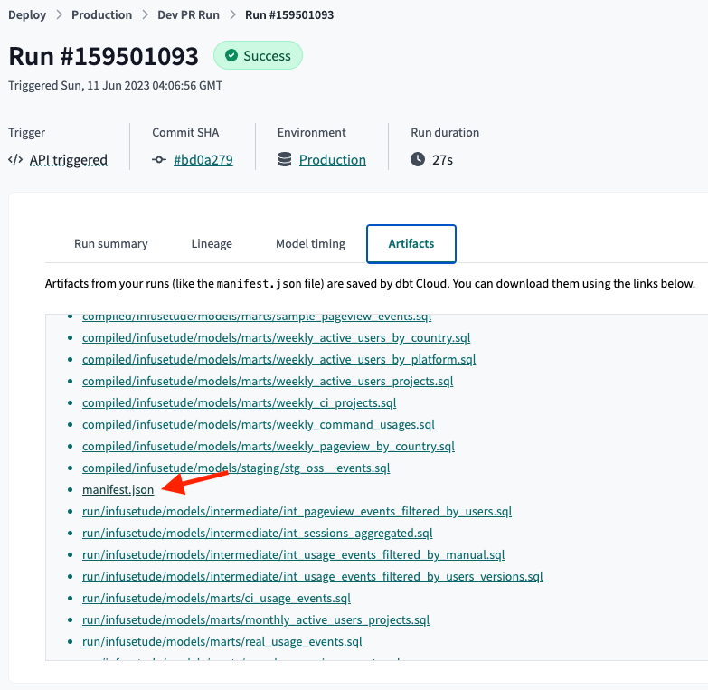 To compare the data models between two environments, you need to download the dbt Cloud artifacts for both environments. The artifacts include the manifest.json file and the catalog.json file. You can download the artifacts from the dbt Cloud UI.