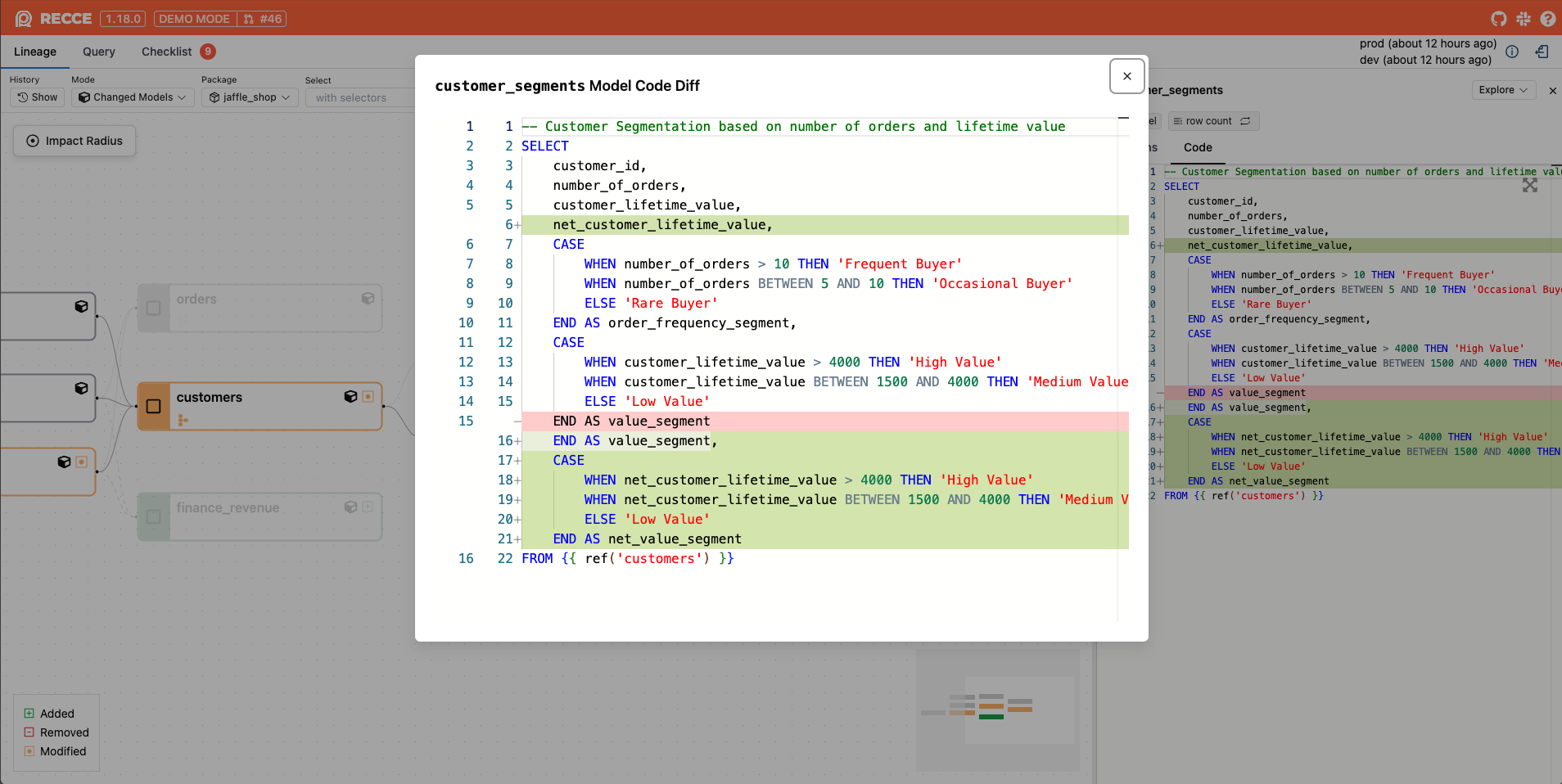 When you identify a modified model in the Lineage Diff, you can examine the specific code changes to understand the nature of the modifications.
