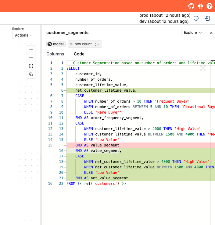 The Code Change feature allows you to compare the SQL code changes between your current branch and the base branch, helping you understand exactly what has been modified in your dbt models.