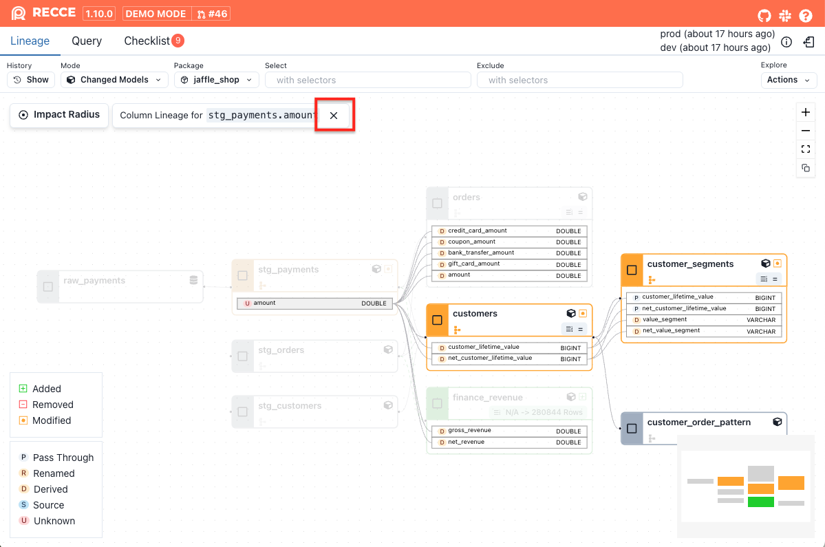 To exit column-level lineage view, click the close button in the upper-left corner.