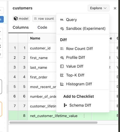 Click the "Explore Change" button to access pre-built validation checks that save time on writing SQL: