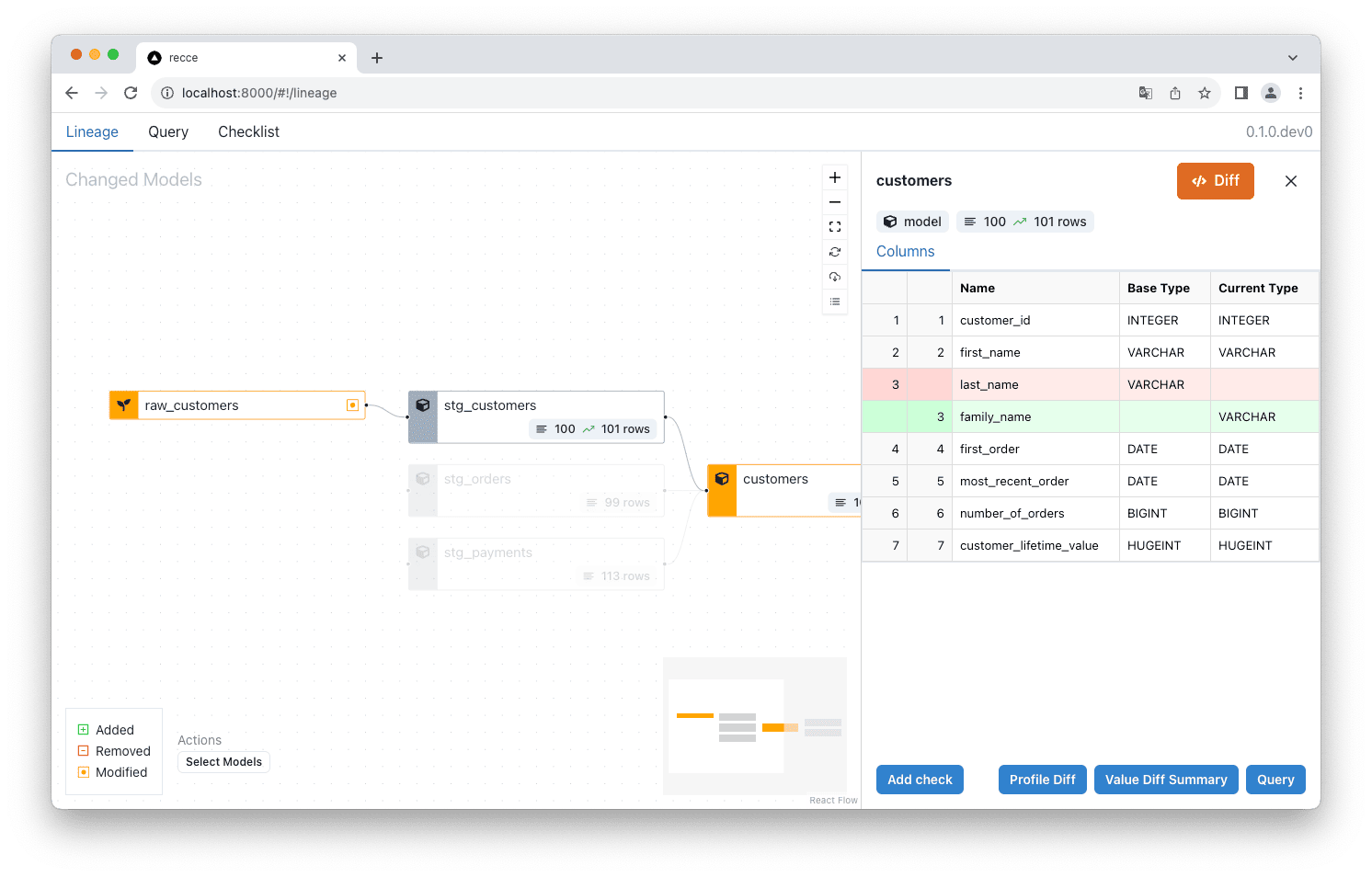 Data lineage tracks the flow and transformation of data through your dbt project. In Recce, the lineage graph shows: