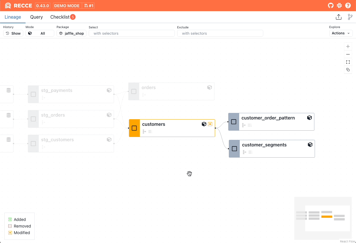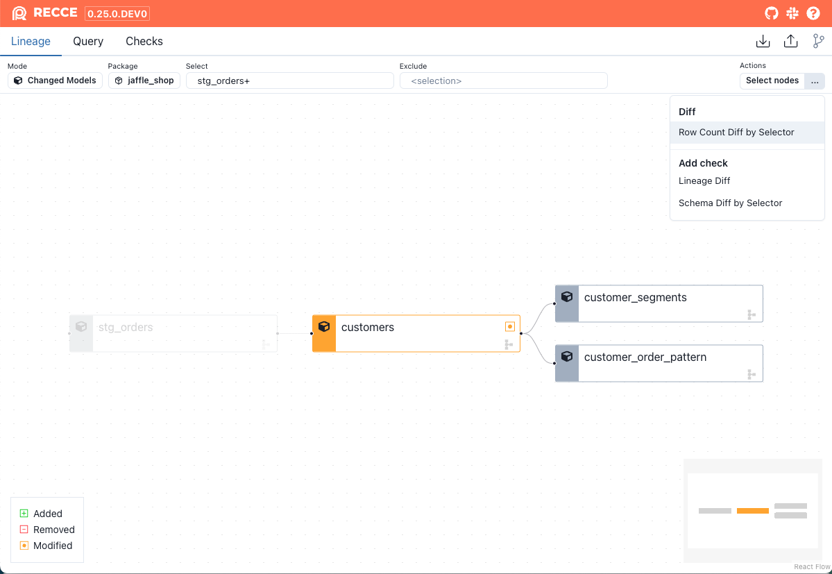 Recce supports dbt node selection in the lineage diff. This enables you to target specific resources with data checks by selecting or excluding models.