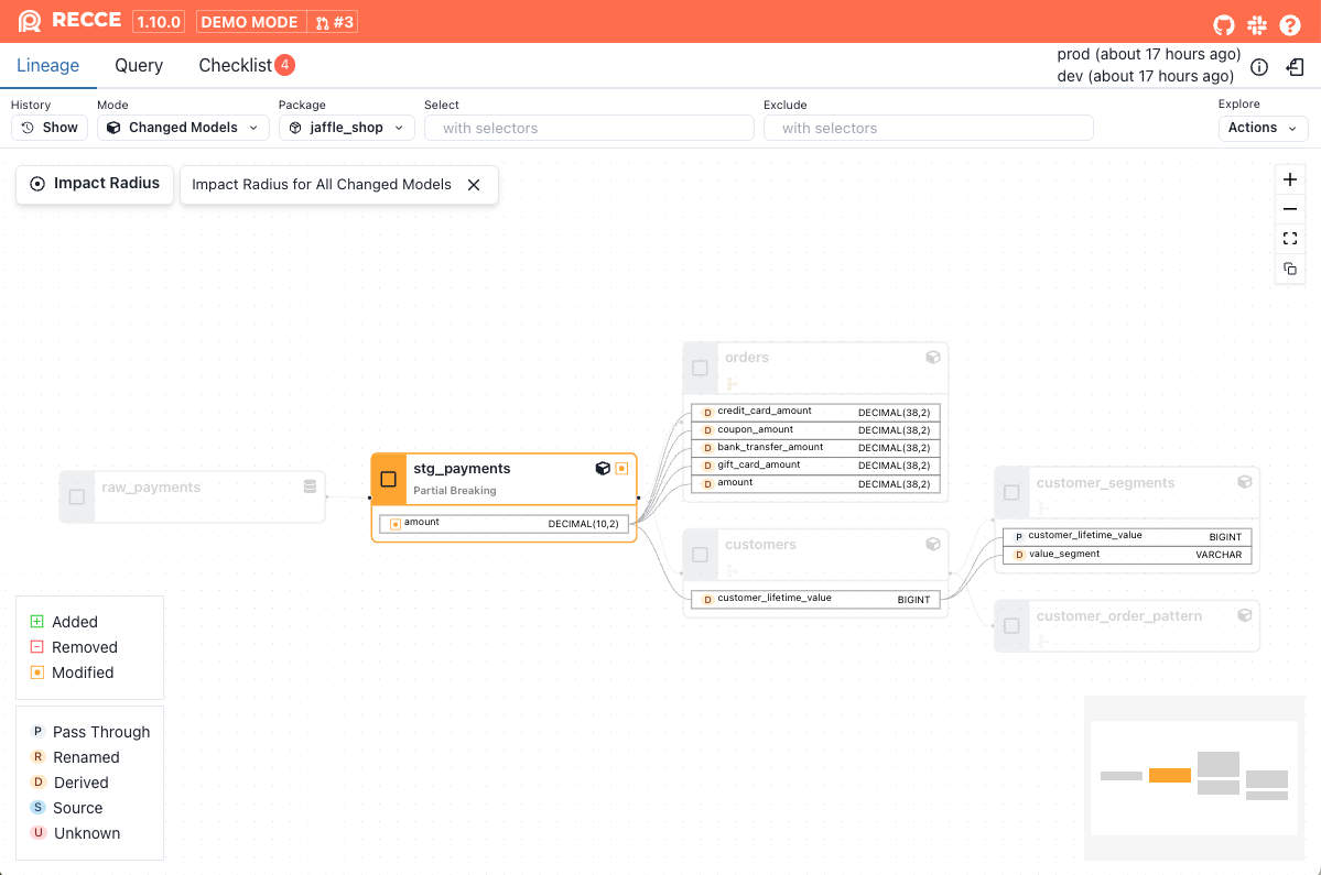 to identify modified nodes and their downstream dependencies, Recce goes further. By analyzing SQL code directly, Recce enables fine-grained impact radius analysis. It reveals how changes to specific columns can ripple through your data pipeline, helping you prioritize which models—and even which columns—deserve closer attention.