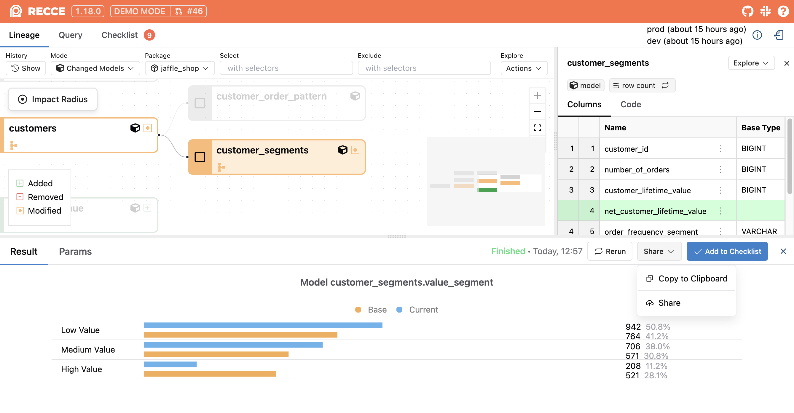 When stakeholders need full context but don't have the environment to run Recce locally, use Recce Cloud sharing. This method creates a read-only link that provides complete access to your validation results.