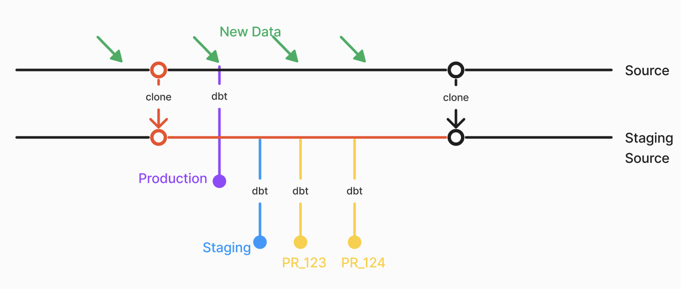 A moderately sized data project may have multiple branches in development simultaneously. To avoid interference, it is recommended that each PR have its own isolated PR environment. The schema name can be pr_<number>