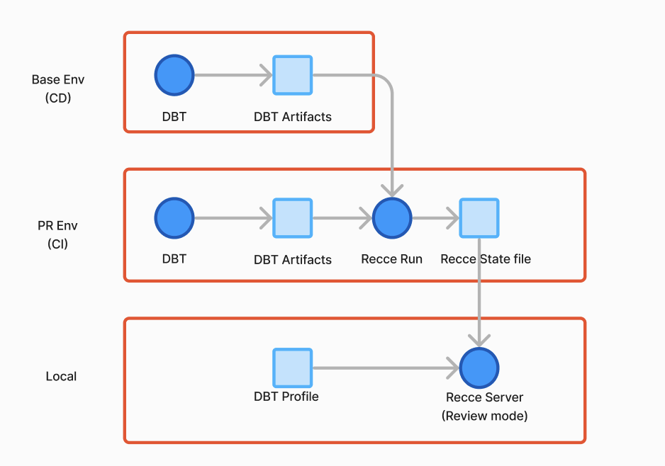 command for CI/CD pipeline. You can integrate Recce with GitHub Actions (or other CI tools) to compare the data models between two environments when a new pull-request is created. The below image describes the basic architecture.