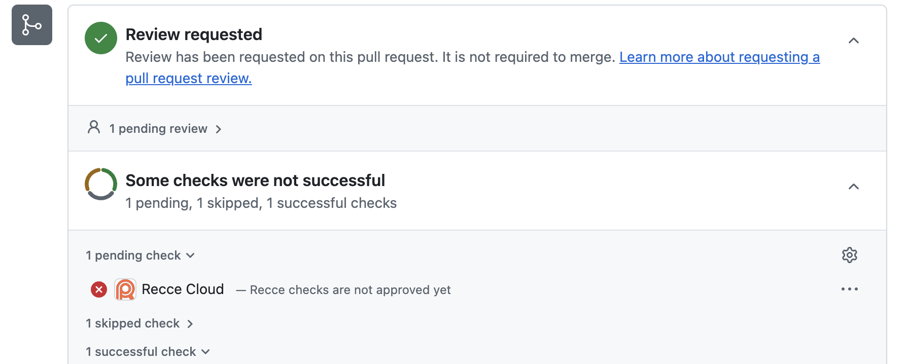 Recce checks appear as status checks on your PR. The blocking is from the Recce Cloud GitHub App and runs automatically. When configured as required checks, reviewers must approve all checks in the checklist before the PR can be merged.