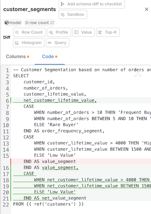 When you identify a modified model in the Lineage Diff, you can examine the specific code changes to understand the nature of the modifications.